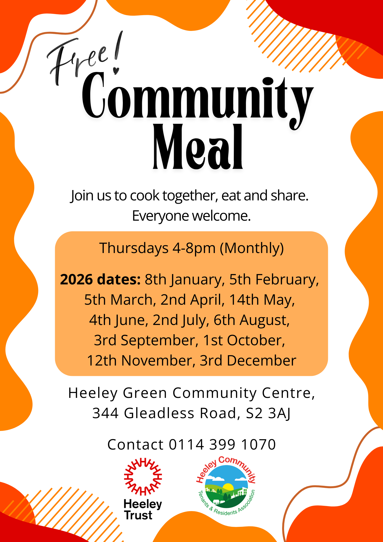 Our monthly community meals are part-funded by Heeley Community TARA, and are a great opportunity to share food and conversation with other local people.